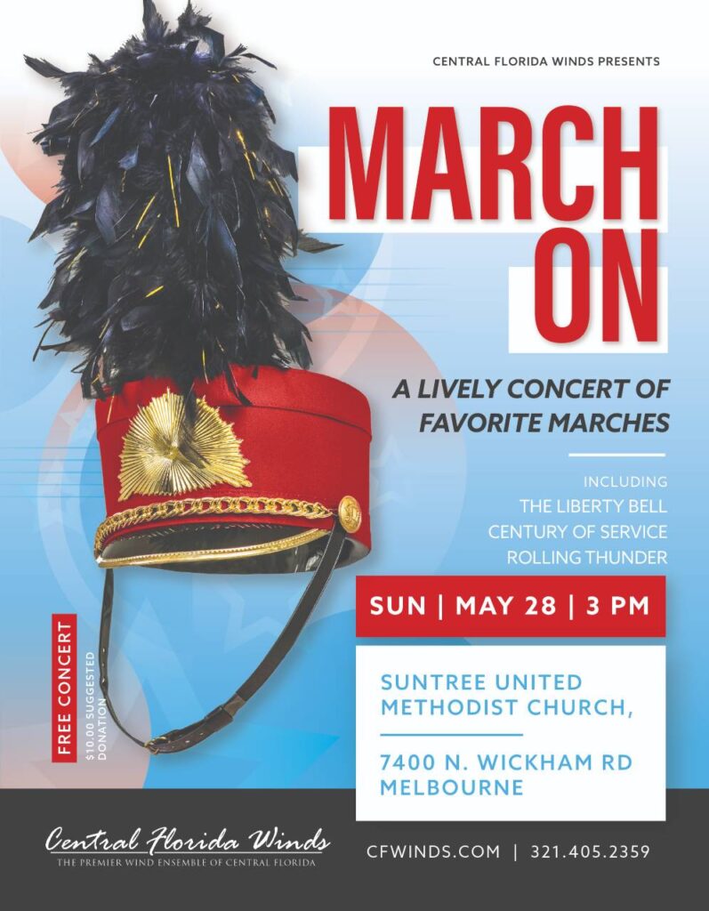 Topic: The perpetual bang of a drum or proudful beckoning of a horn has facilitated military marches for centuries. The stirring rhythms are riveting and inspiring, so it’s easy to envision dynamic tempos propelling battalions onward with patriotic pride. (Central Florida Winds presents “March On!”, a free concert featuring a collection of favorite marches.)